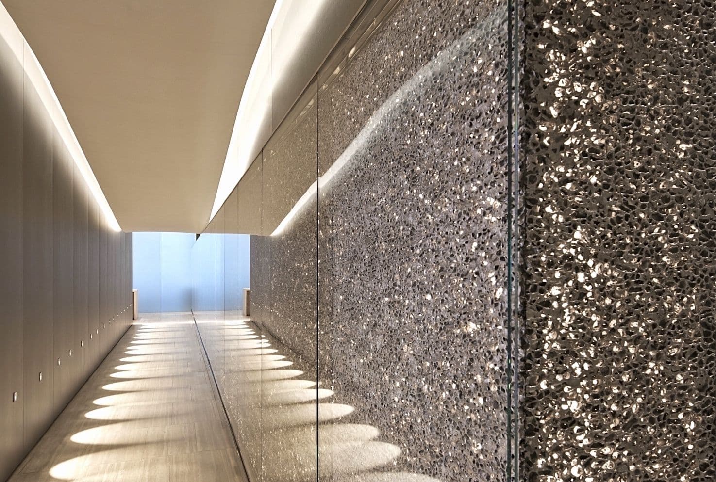 ALUSION™ is an architectural stabilised aluminium foam made of a minimum 25% post-consumer recycled aluminium, that can be endlessly recycled. It is produced as flat sheets in a variety of thicknesses and porosity densities, the sheets are strong and lightweight. Air is injected into molten aluminium to create the bubbles which give the foam effect. It comes in a natural silver metallic aluminium finish, or powdercoat colours can be selected.