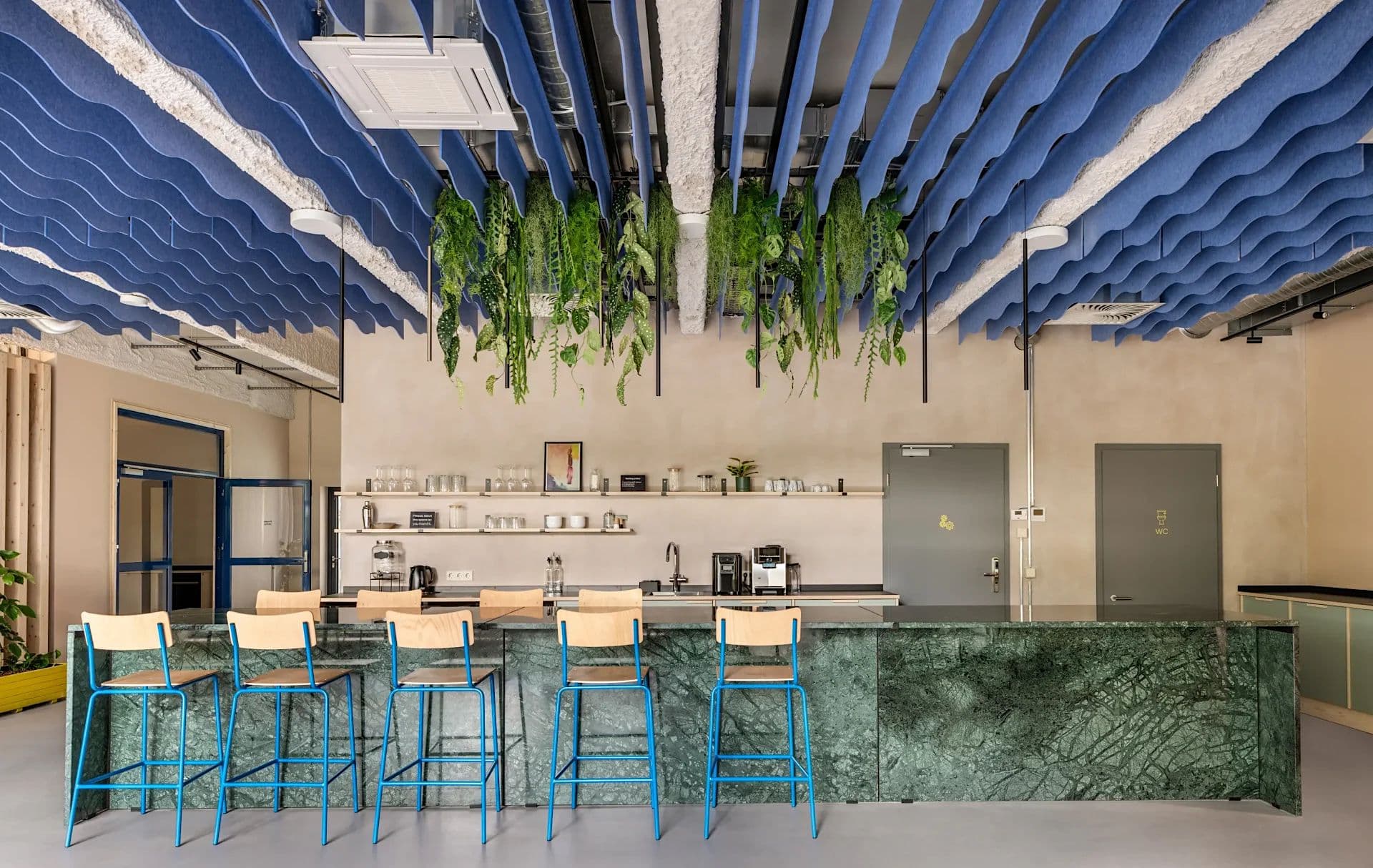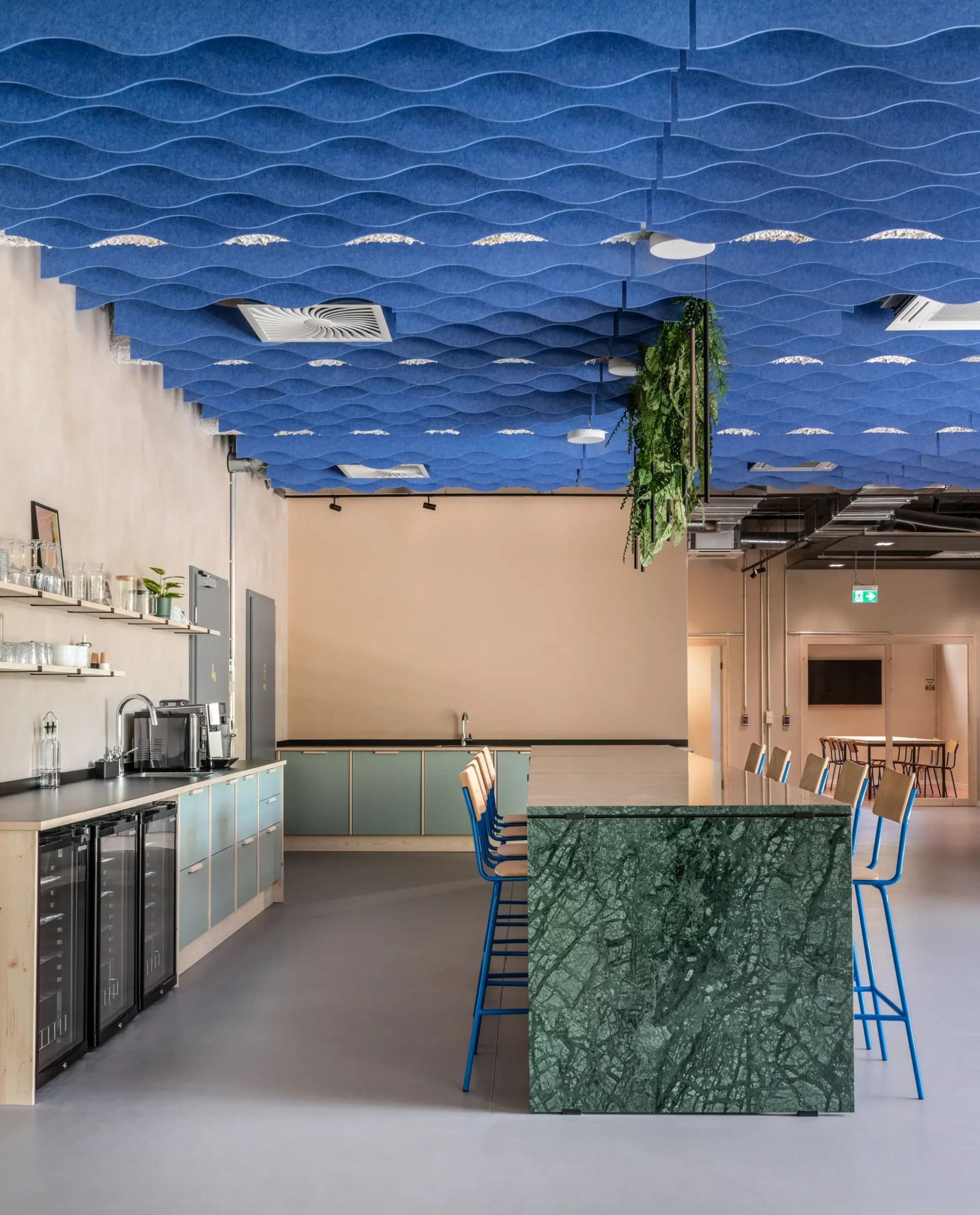 All in one acoustic ceiling system. To let our PET Felt Acoustic Baffles Wave hang in the best way possible, we’ve developed the EasyGrid system, with which you have 4 suspension points and don’t need any tools to install the acoustic ceiling system. You don’t even have to worry about any height issues, as you can adjust the height in whichever way you like.