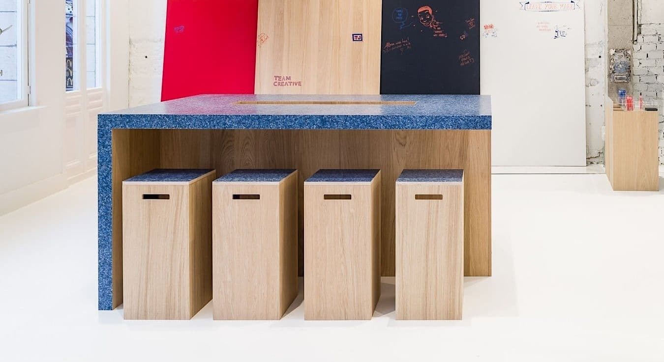 The veneer is made of textile waste, such as old denim, army clothing, suits and white denim. But also from biobased fibres, such as flax, hemp, and jute coffee bags. The fibres are first shredded into small pieces and then carded into felt. The felt is eventually pressed with a biodegradable binder made of potato or corn starch into a hard veneer. This veneer lends itself perfectly to new high-end products.
